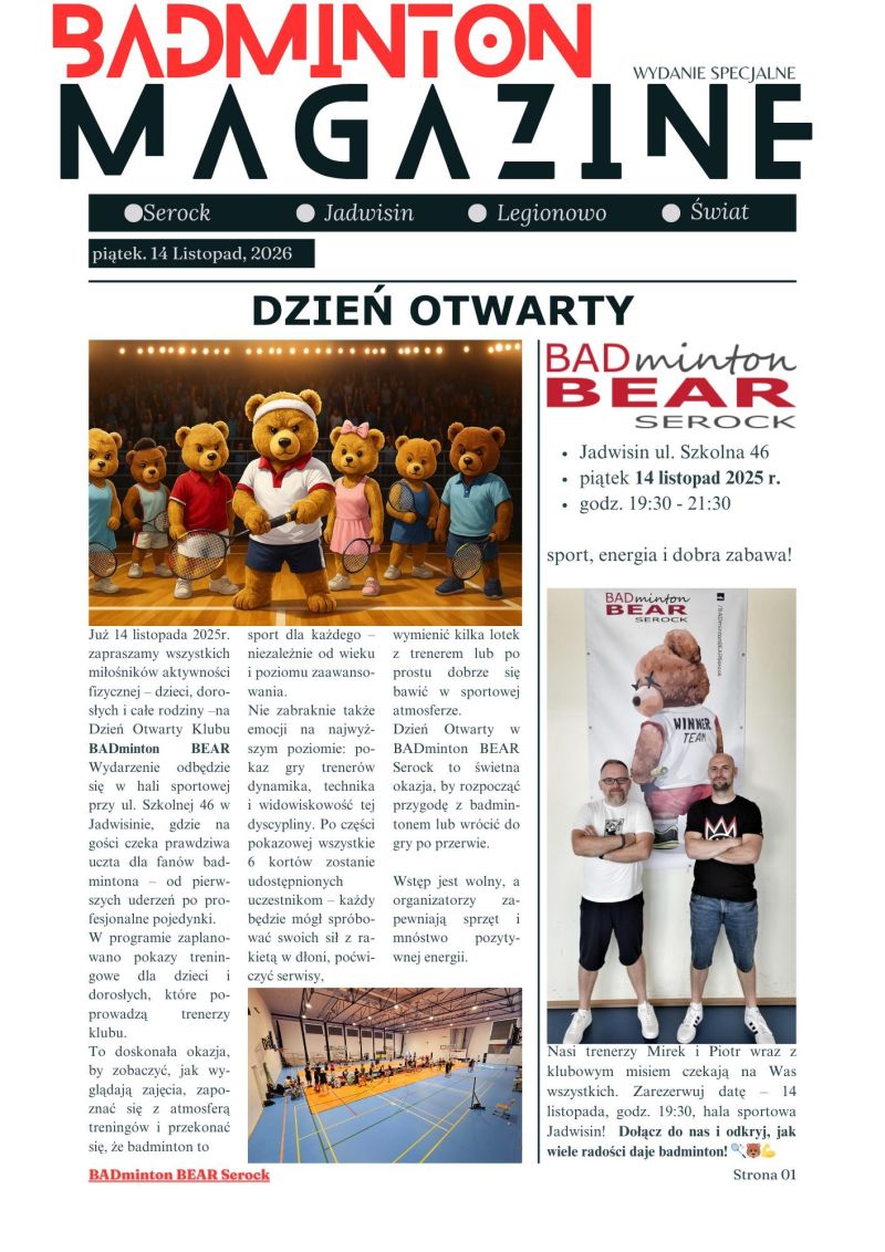 14 listopada 2025 roku zapraszamy wszystkich miłośników aktywności fizycznej – dzieci, dorosłych i całe rodziny – na Dzień Otwarty Klubu BADminton BEAR Serock.